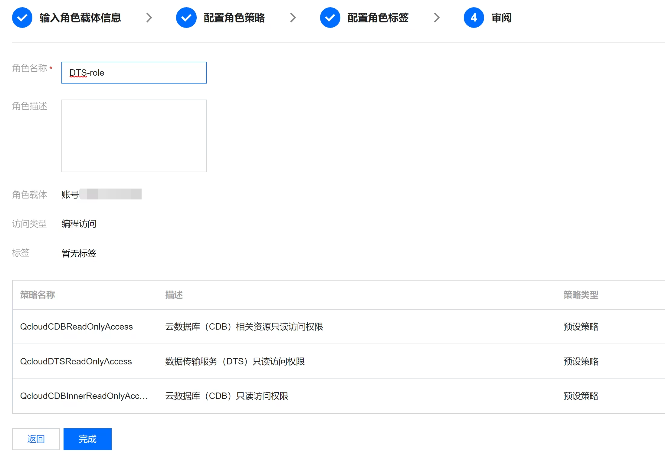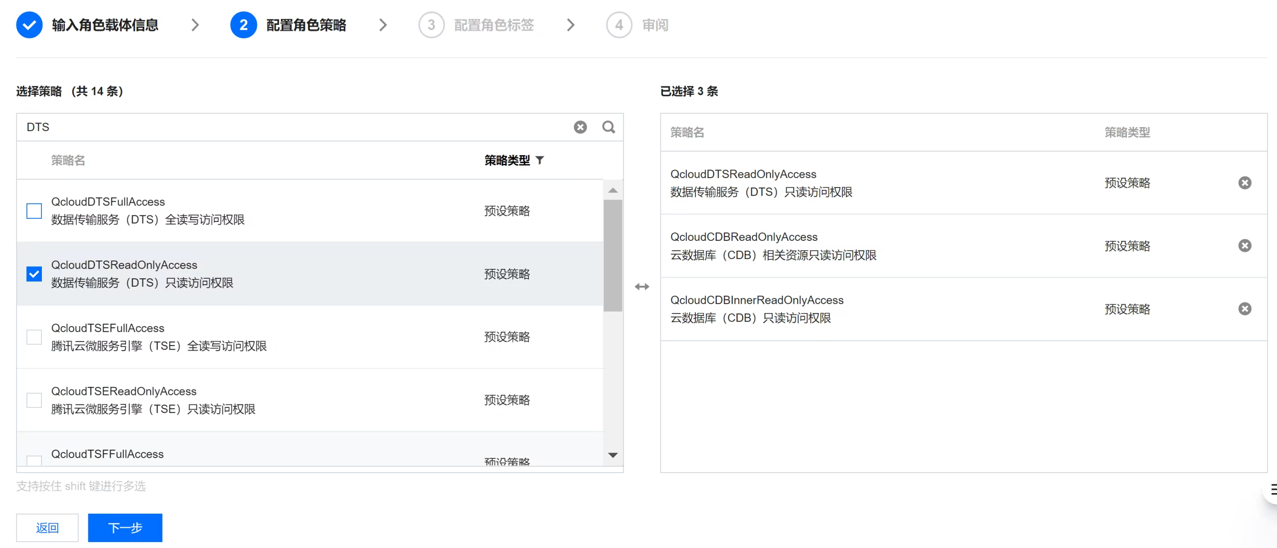 DTS 服务策略,选择 QcloudDTSReadOnlyAccess。