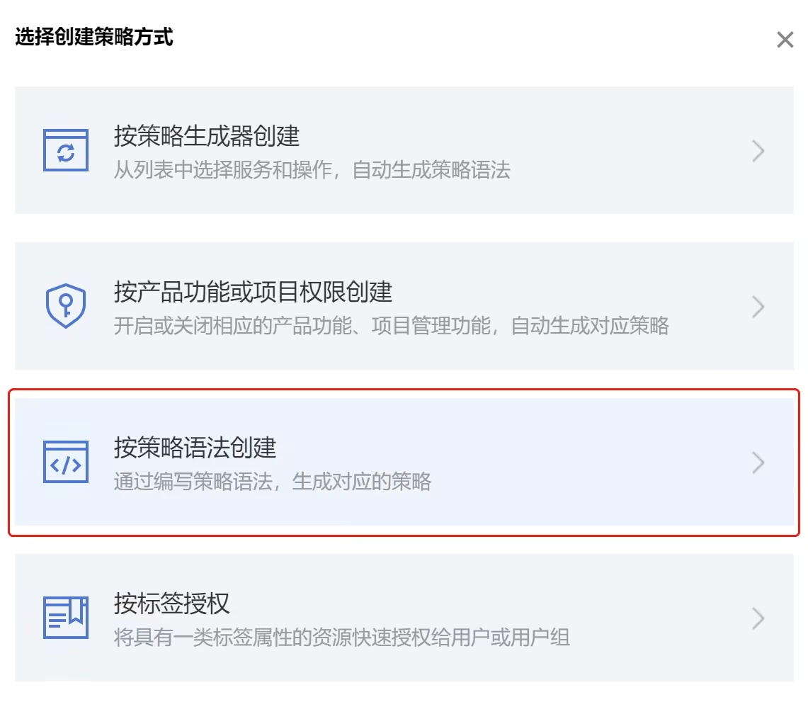 (可选)使用目标数据库所属的腾讯云主账号登录 访问管理控制台,在左侧导航单击策略,然后在右侧单击新建自定义策略,并选择按策略语法创建。