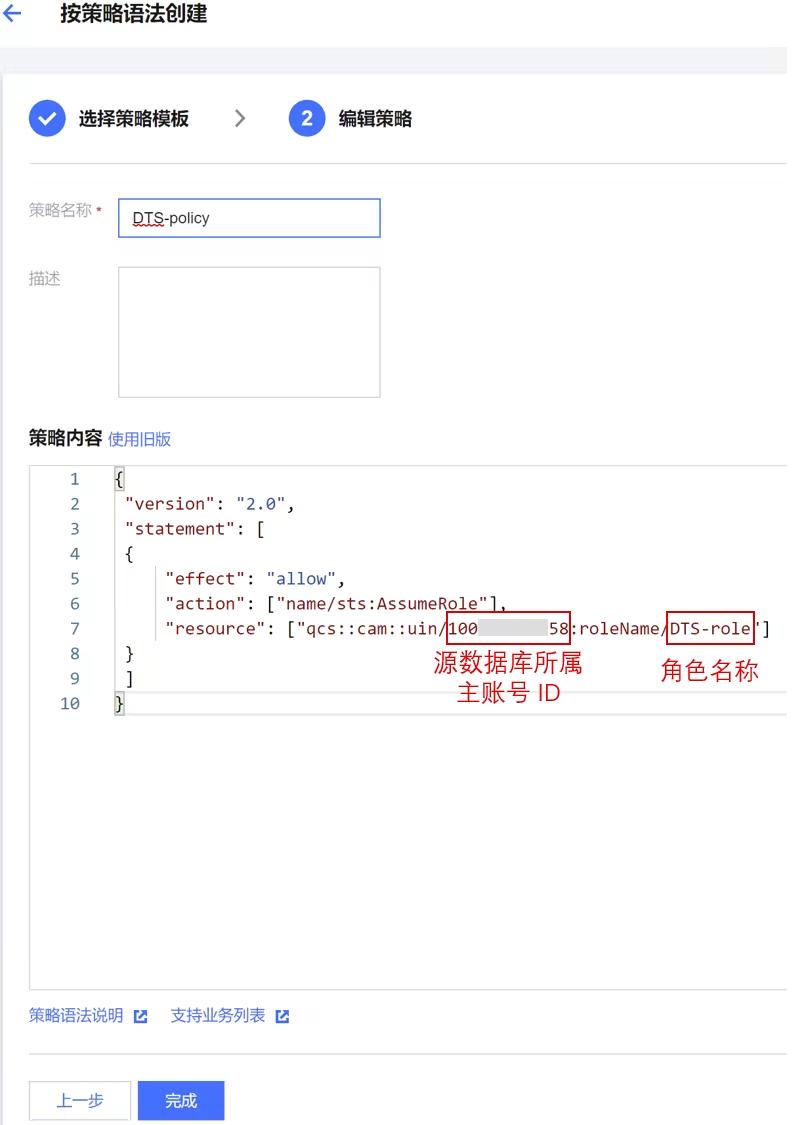 { "version": "2.0", "statement": [ { "effect": "allow", "action": ["name/sts:AssumeRole"], "resource": ["qcs::cam::uin/10*******8:roleName/DTS-role"] } ]}