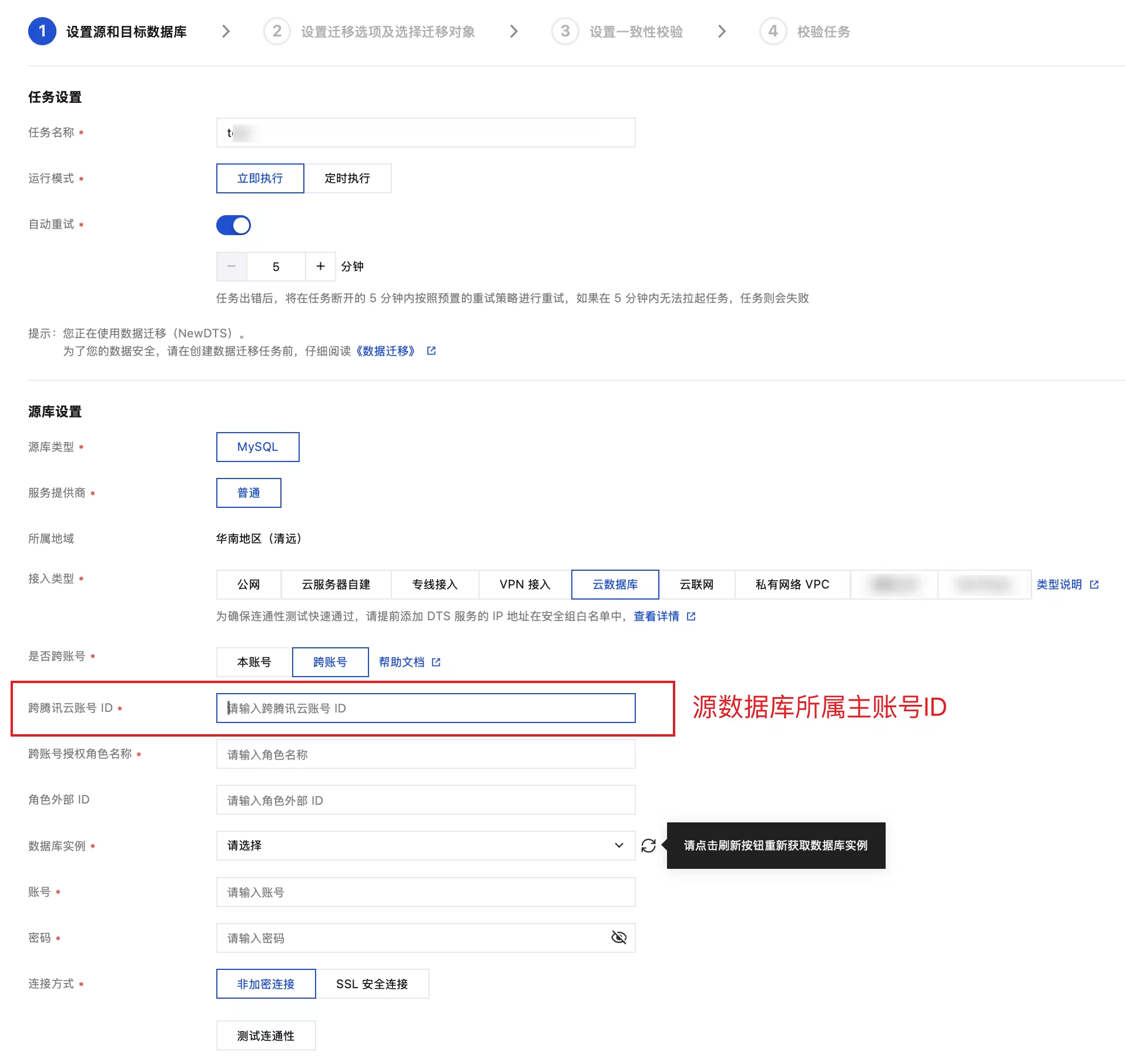 跨腾讯云账号 ID: 填入源数据库所属的主账号 ID。