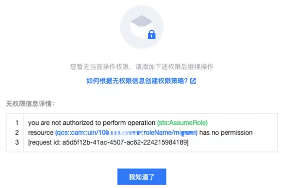 角色中没有授权源数据库所属的腾讯云服务策略,请参考 授权账号 中的步骤5进行授权。