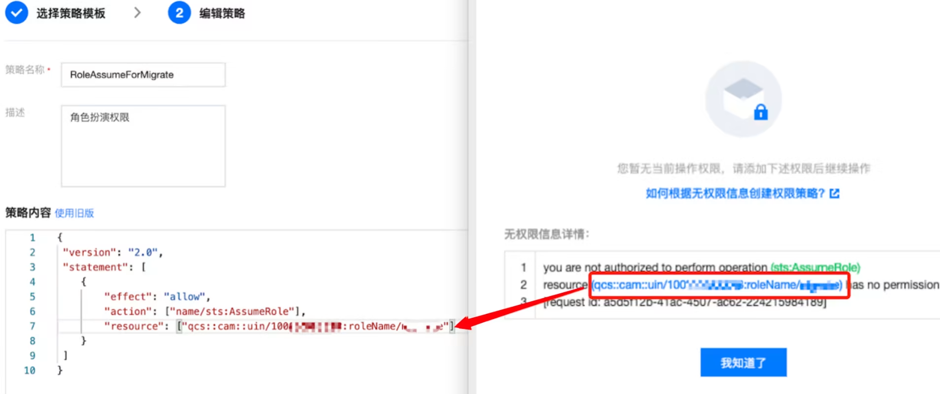 出错原因:您当前创建迁移任务使用的账号是子账号,并且当前子账号没有 sts:AssumeRole 权限。