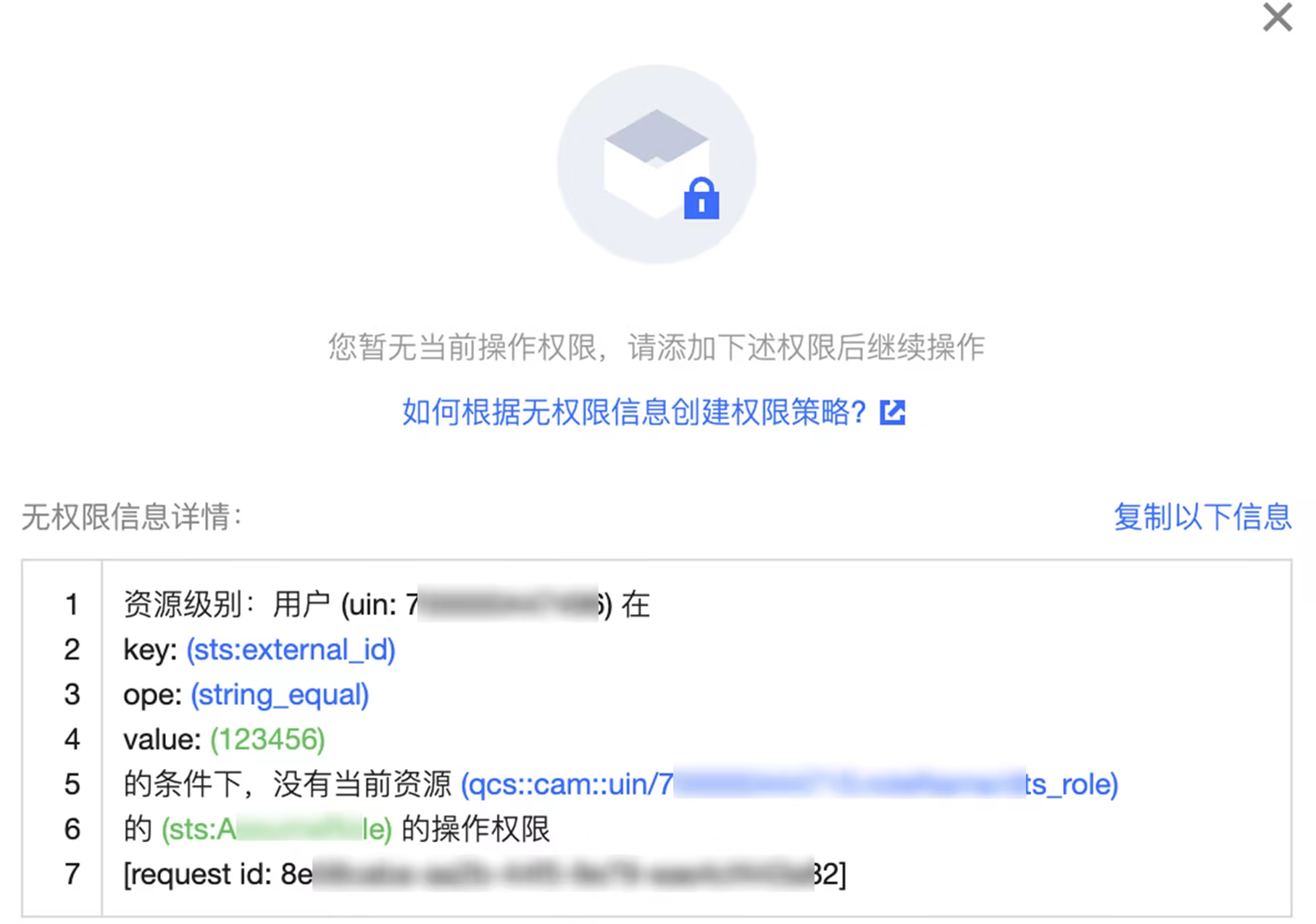 请求目标数据库所属的主账号持有人,参考 授权账号 对子账号授权,策略语法中的 resource,填写报错框中蓝色字段部分。