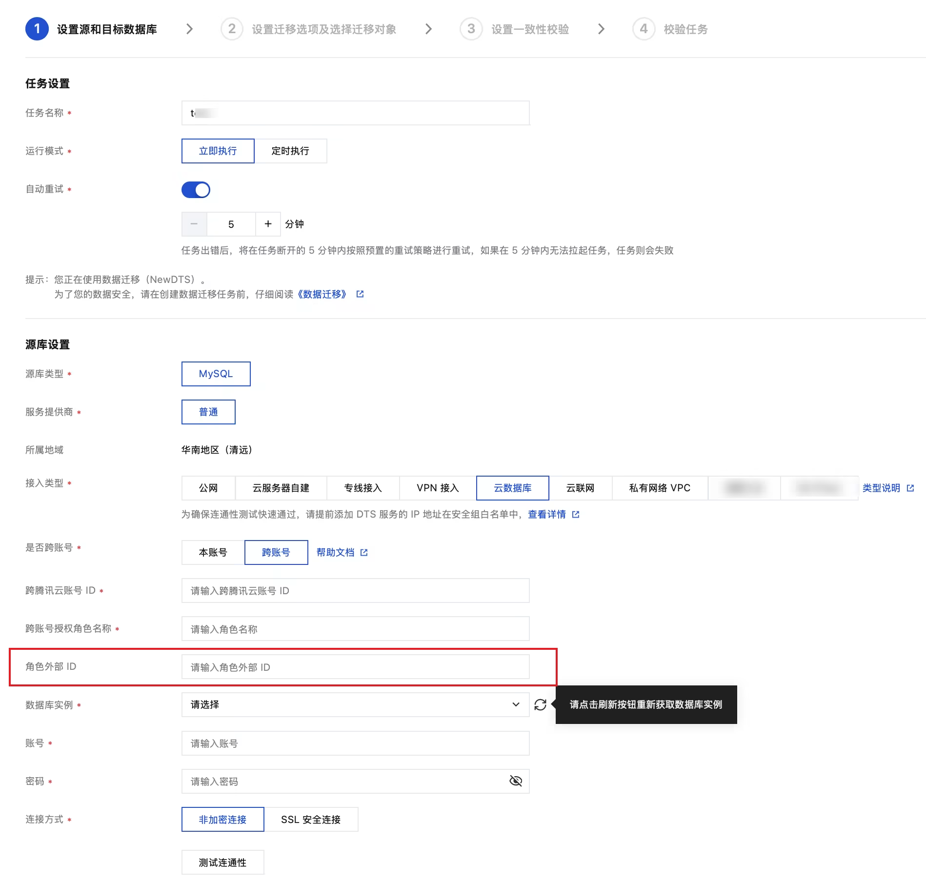 4. DTS 任务配置未填写角色外部 ID,或者填写错误,导致权限报错或者拉取数据库实例失败。