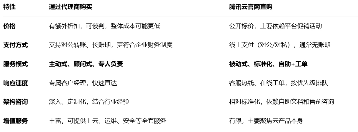 对于中小企业、初创公司,如果技术能力较强,需求简单,官网直购方便快捷。但对于中大型企业、传统行业转型、有复杂业务系统或对服务响应、成本控制、持续运维有较高要求的客户而言,通过一个优质的代理商购买腾讯云,相当于雇佣了一个“专属的云管理团队”。