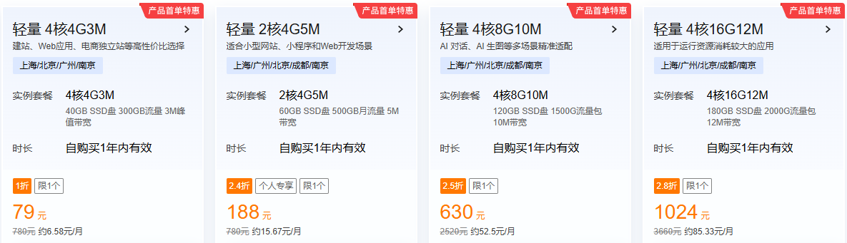 国内备案 + 个人博客:选「国内地域 1 核 1G/2 核 2G 轻量,WordPress 一键镜像」,首年几十到两百元;