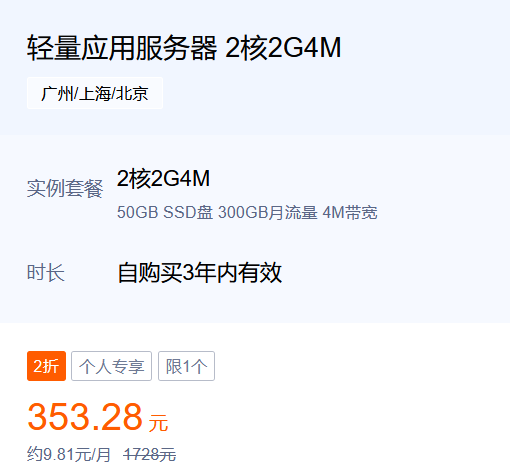 注意: 本次特惠仅限新用户,且每个用户限购1个。353.28元享3年服务,平均每月不到10元,这样的机会千载难逢!腾讯云轻量应用服务器让云计算变得简单、高效、经济,是您开启云服务之旅的最佳选择。