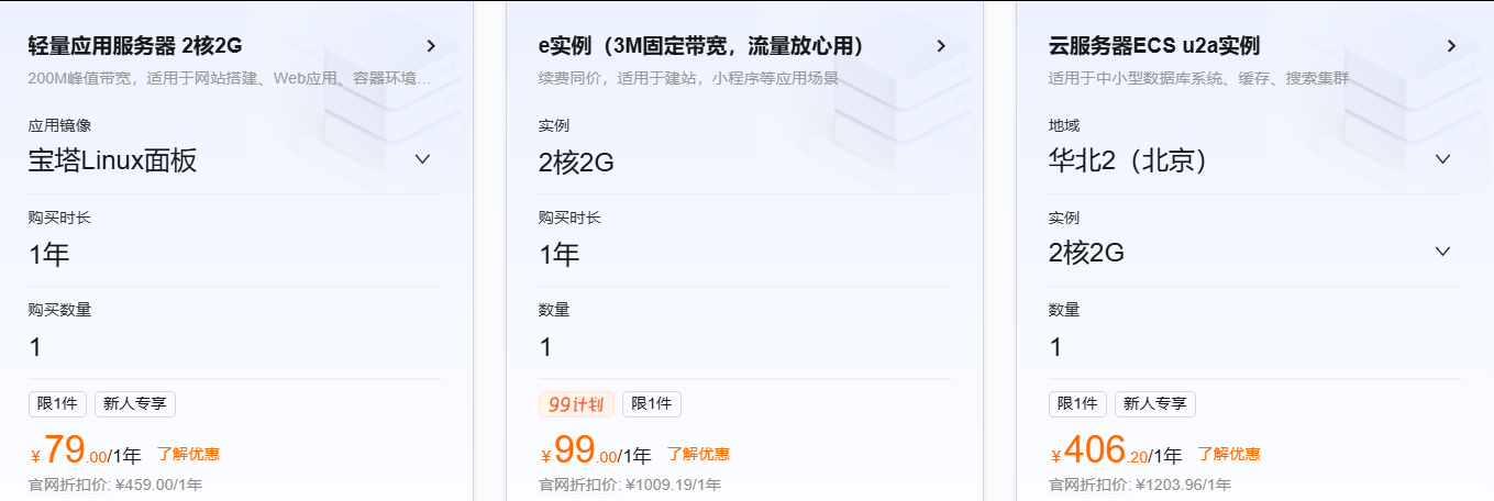 - 经济型e实例:2核2G,3M固定带宽,79元/年