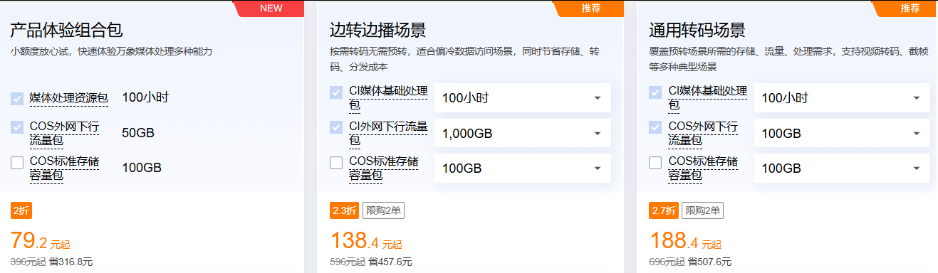 本次活动中,用户可享受 CI资源包按年抵扣 + COS资源包按月抵扣 的组合购优惠,一站式解决存储与处理需求。例如: