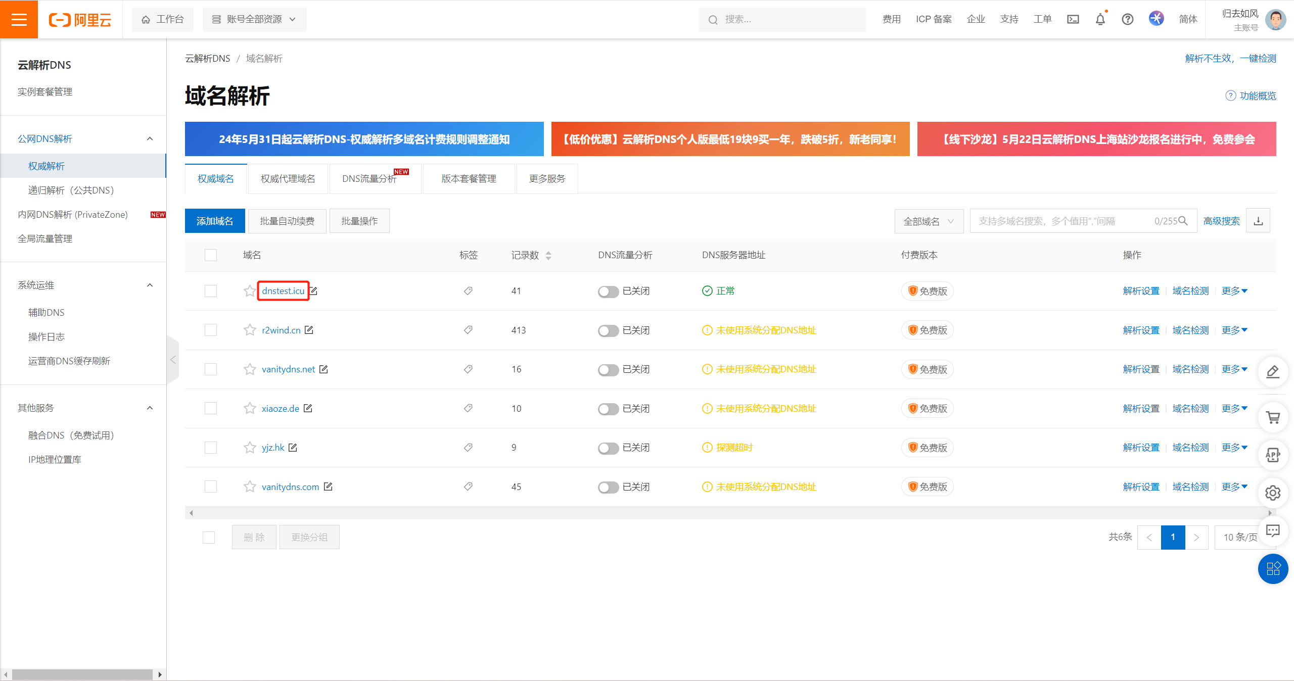 - 登录阿里云 DNS 控制台,选择并点击需要设置的域名。