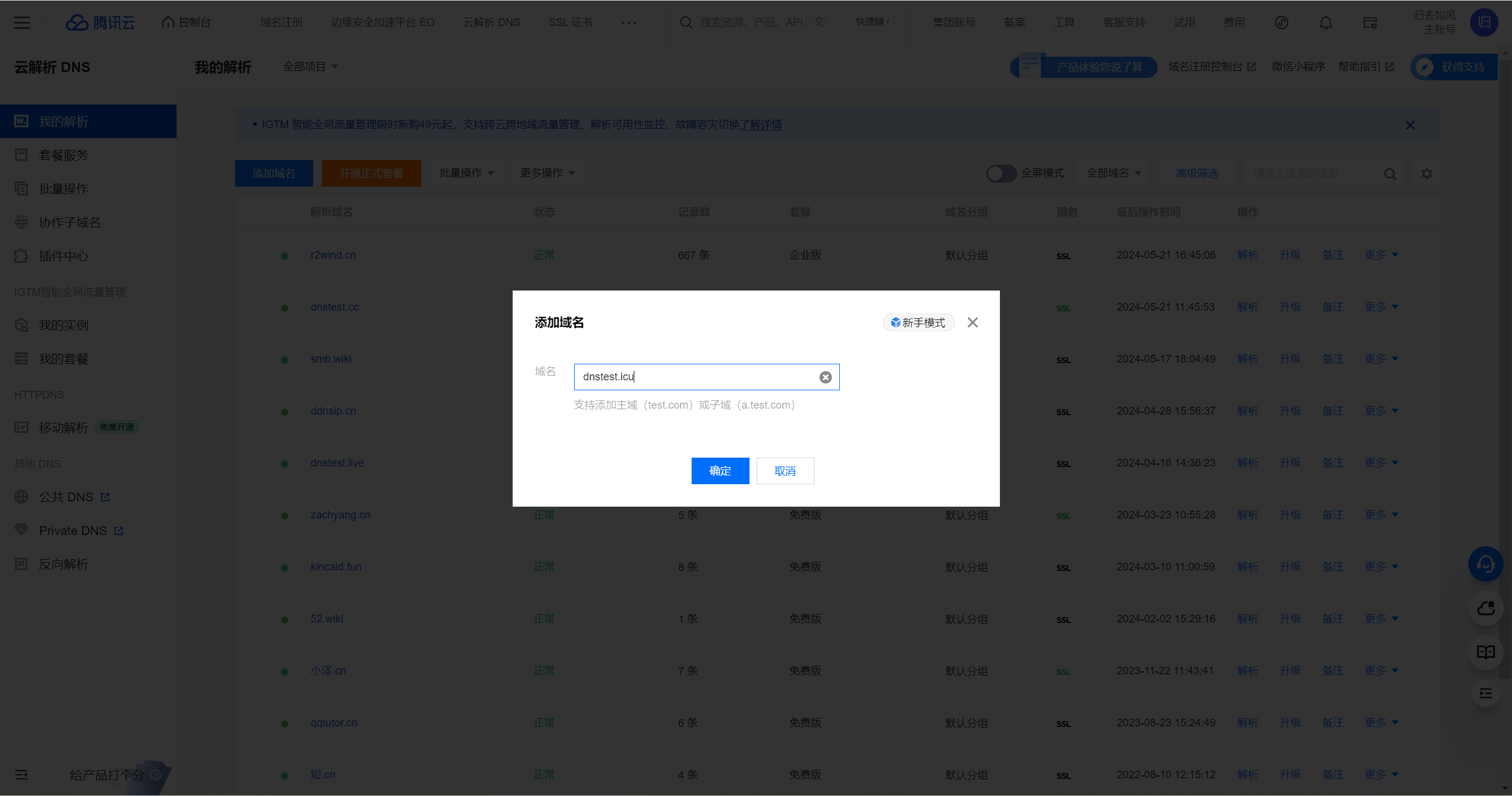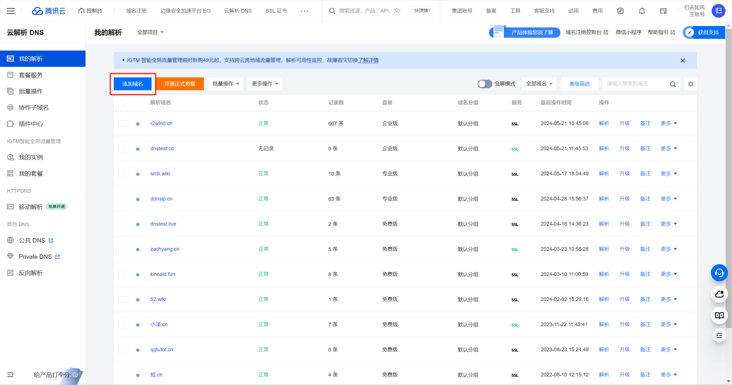 - 登录腾讯云解析 DNSPod 控制台,单击添加域名: