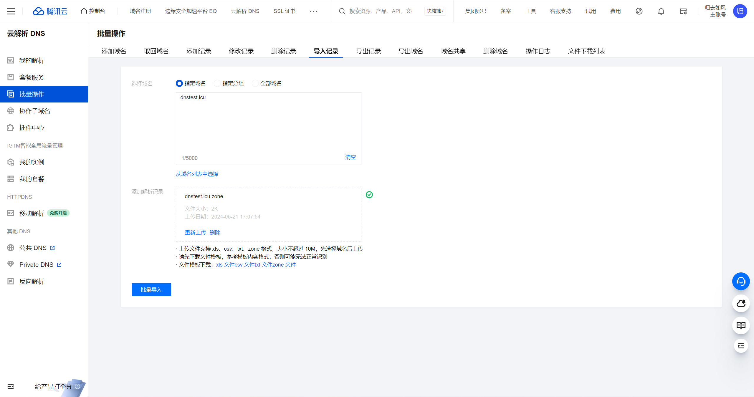 添加完成后前往批量操作-导入记录页面,输入需要迁移的域名,上传刚刚在阿里云导出的zone区域文件,并单击批量导入: