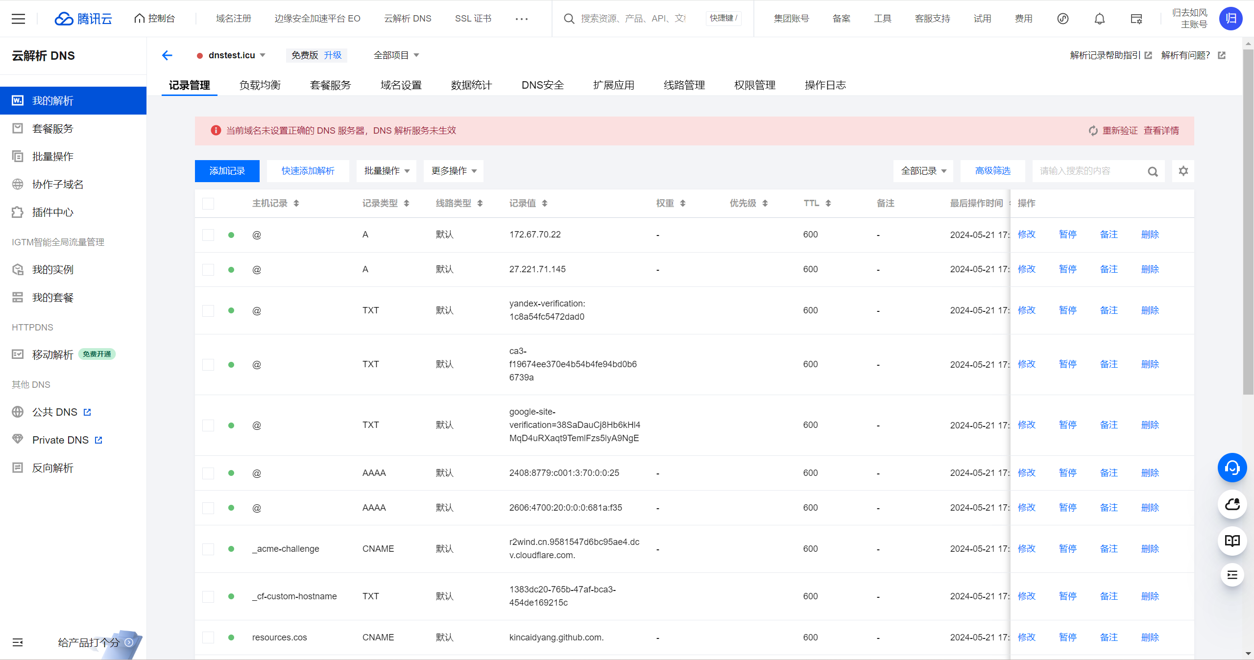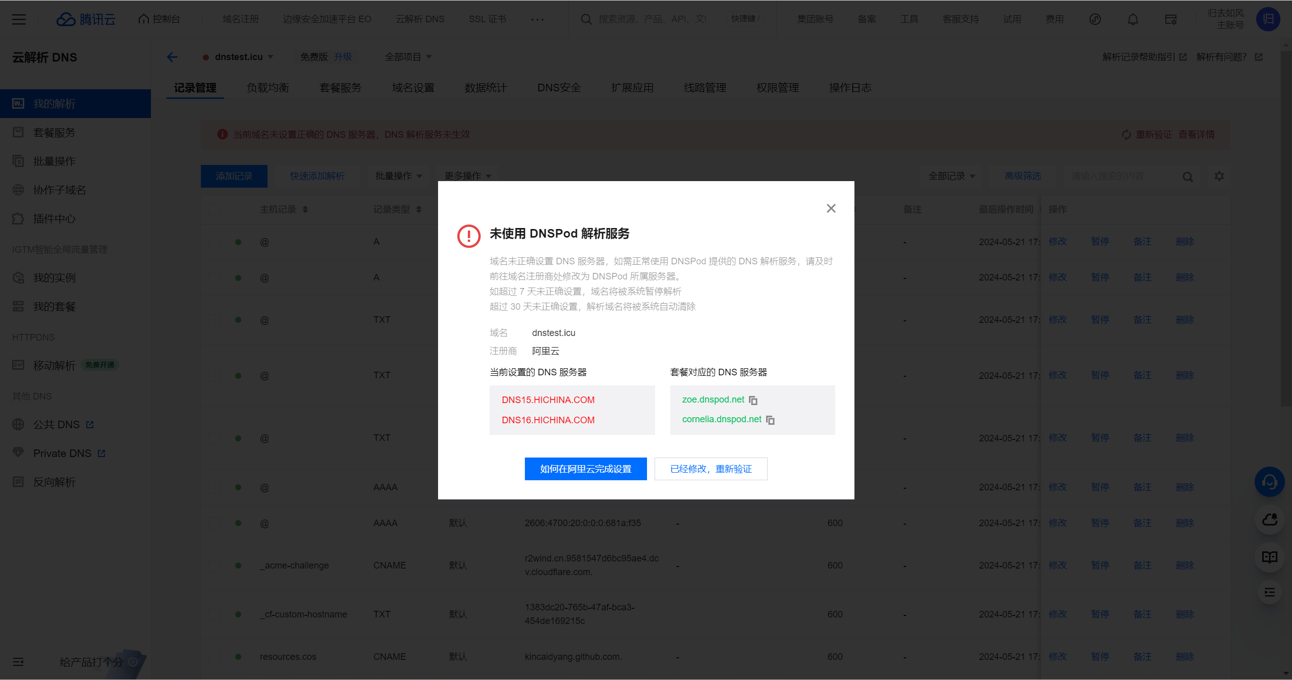 - 如您在生效期间需要修改 DNS 解析记录,请同时在两边修改,保持阿里云解析和腾讯云 DNSPod 解析记录一致。