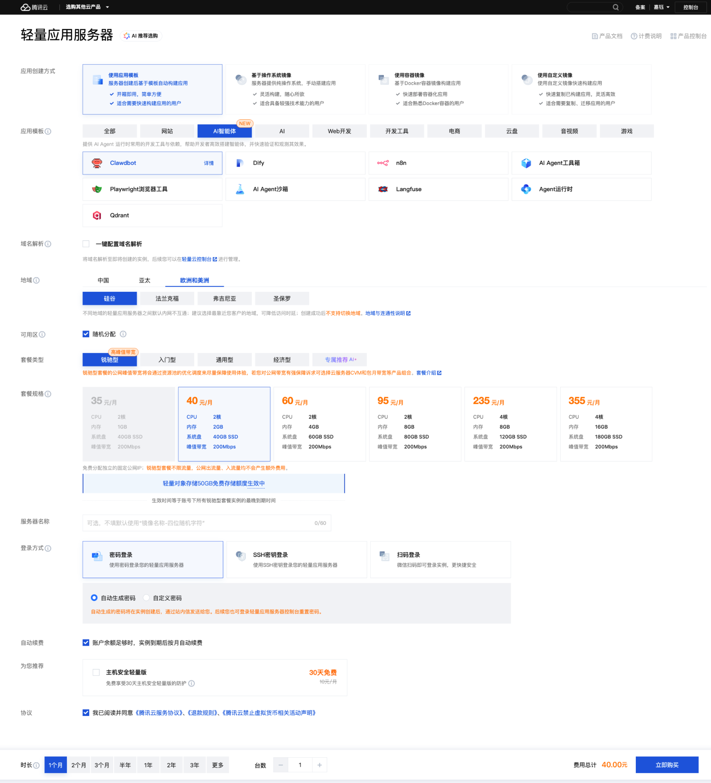 - 选择镜像、地域及套餐: