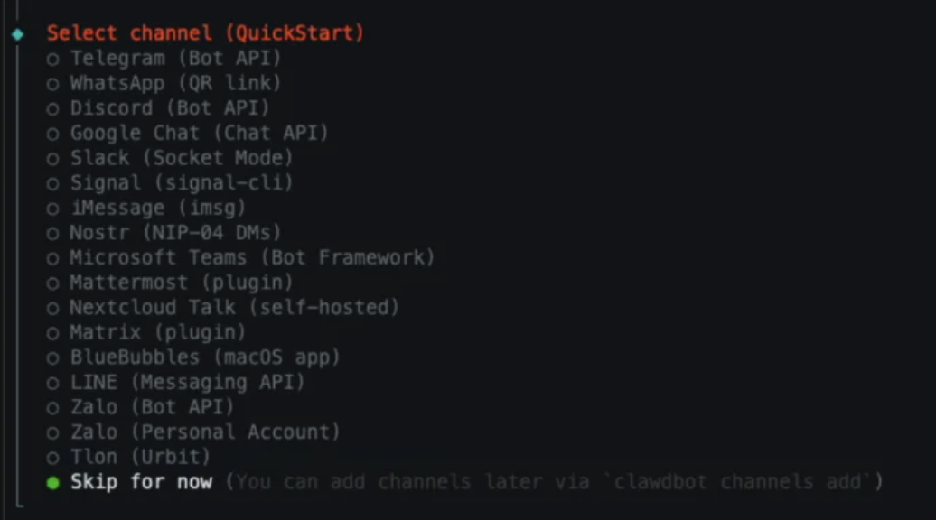 由于QQ未在默认配置列表中,此处选中 “Skip for Now”(后续将单独配置QQ接入,不要选择其他聊天软件),按回车键确认;