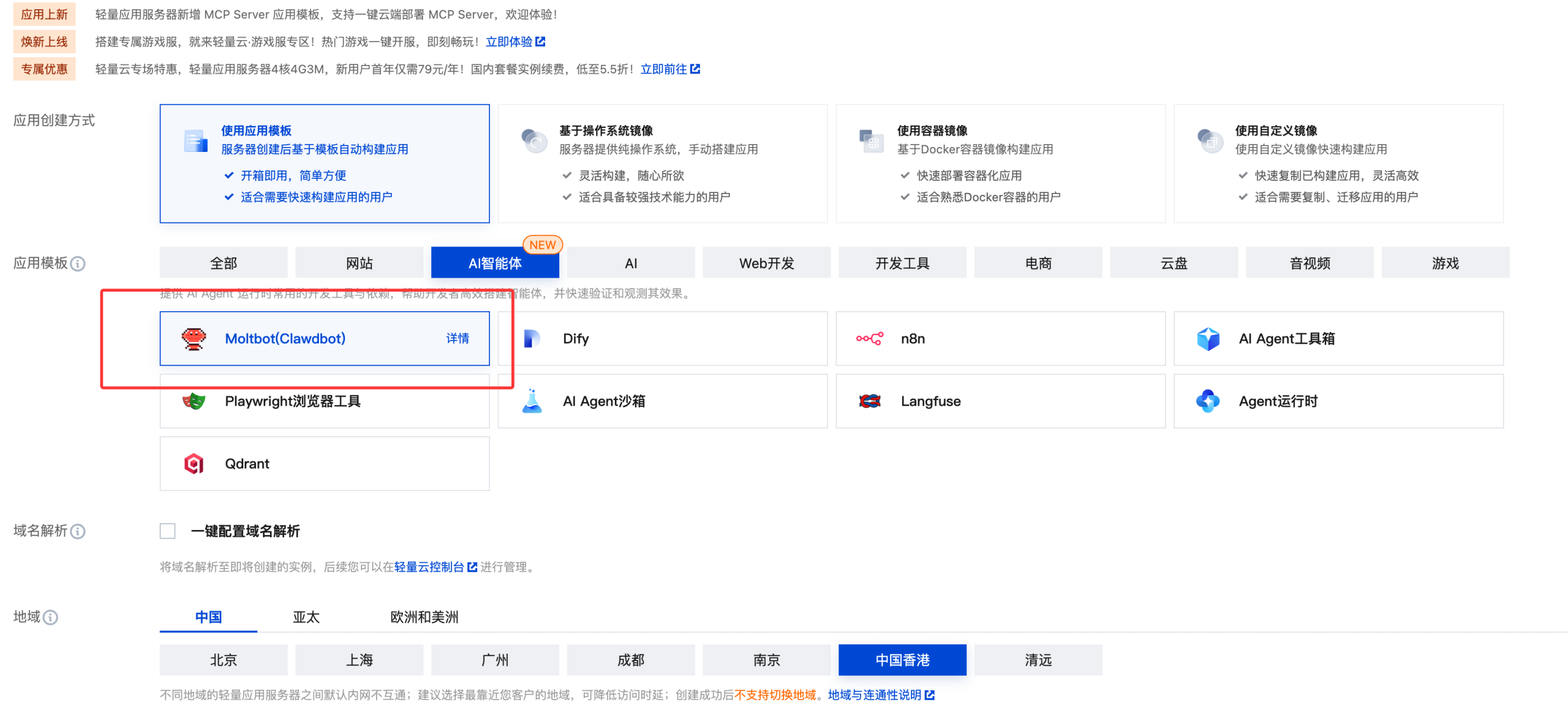 - 选择镜像、地域及套餐:
