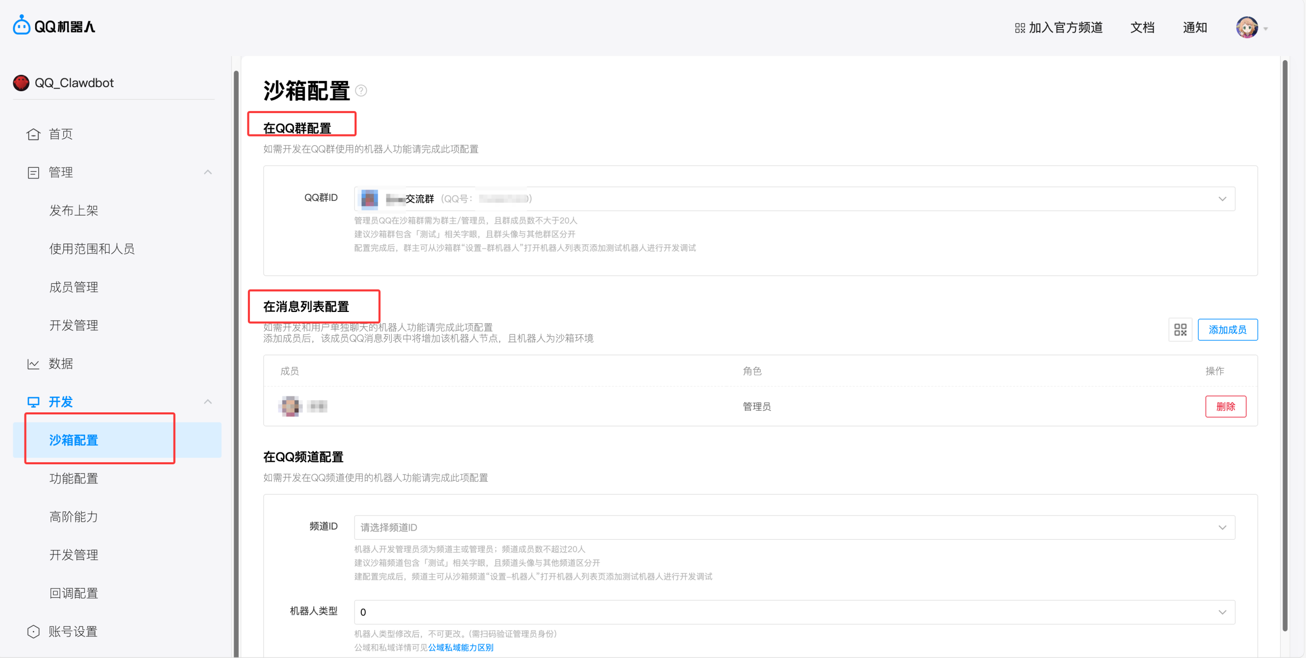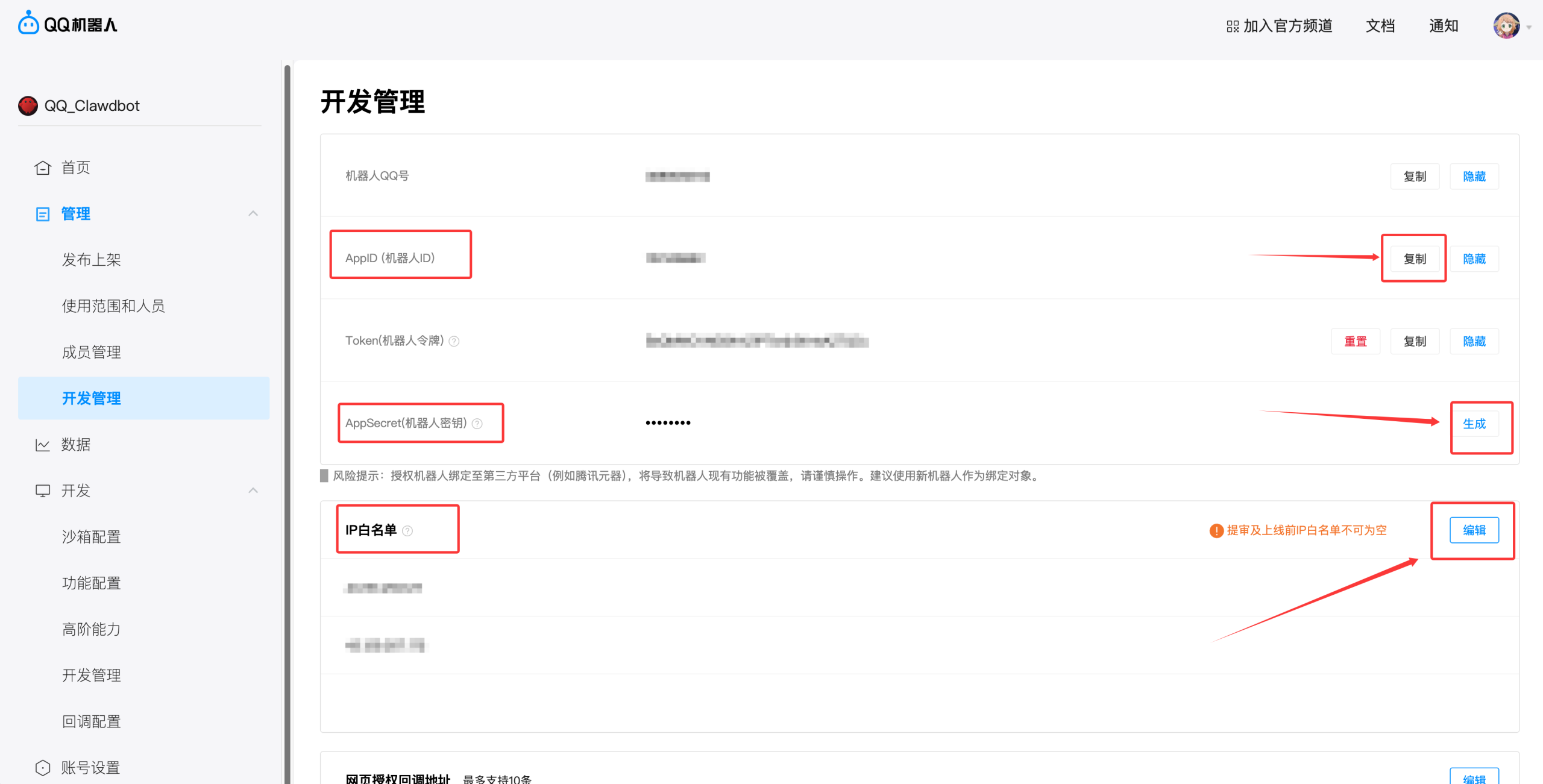 在管理页面获取到当前机器人的AppID, 和AppSecret,这两个很重要 QQ机器人管理端